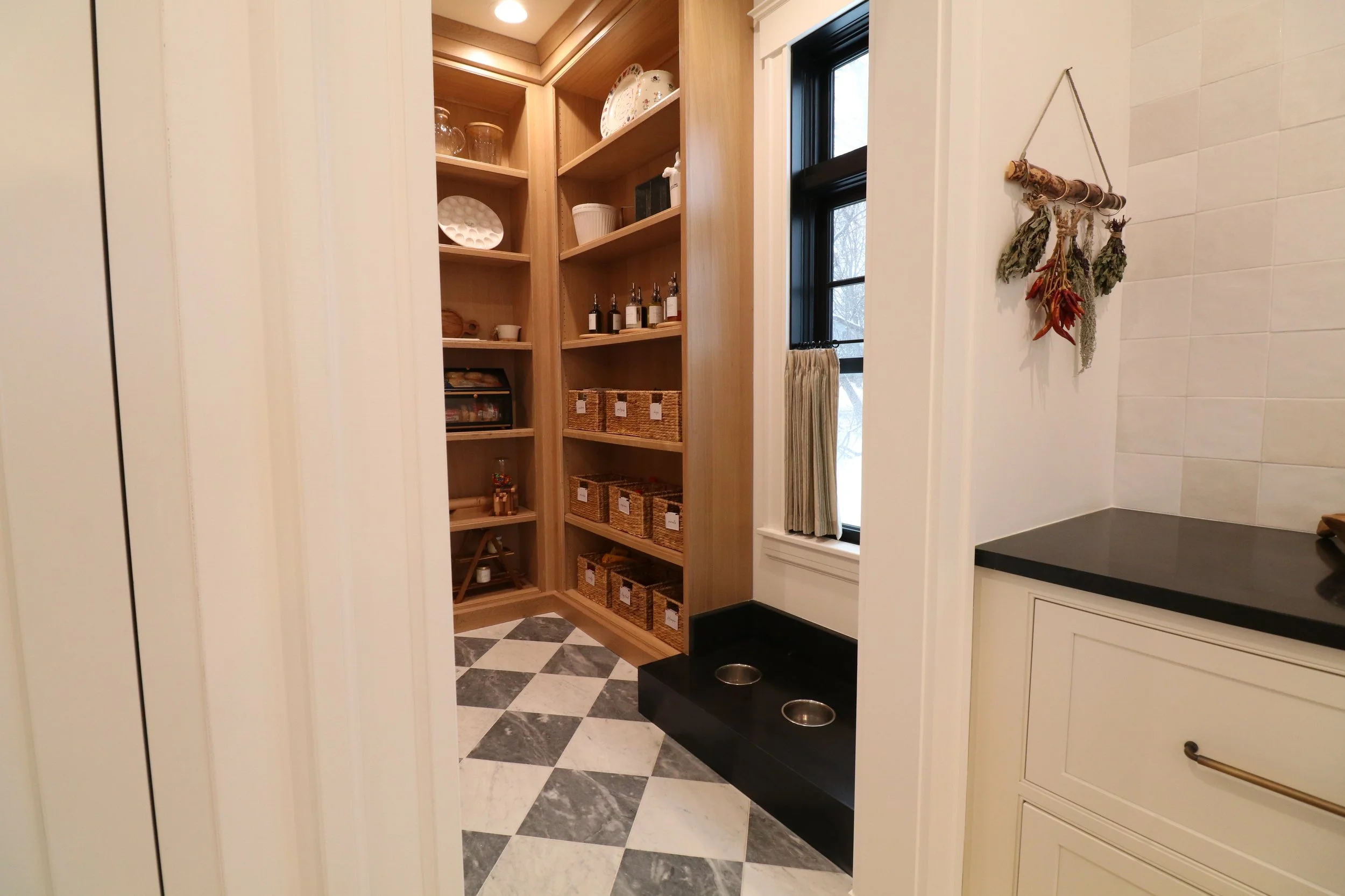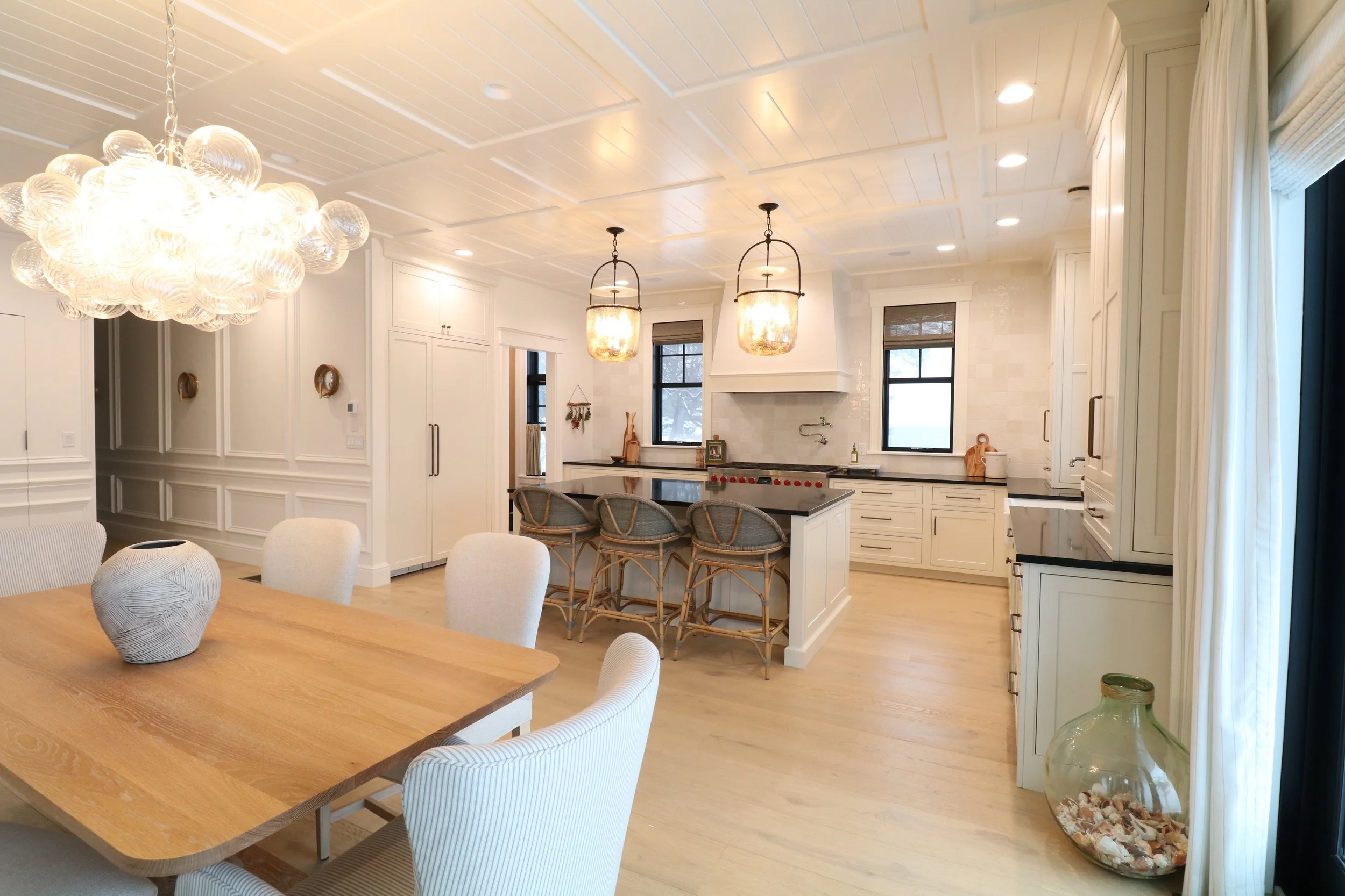 Step into a coastal retreat with this charming beaded inset kitchen featuring Polar-painted cabinets that exude crisp sophistication against black countertops, accentuated by the captivating texture of Zellige tile. In the pantry, natural light-stained wood cabinets complement marble checkered floors, adding warmth and natural elegance. The lighting choices reflect coastal vibes, with Visual Comfort's Lorford Smoke Bell Lanterns in an aged iron finish resembling lobster pots, casting a warm glow. The dining room showcases the elegant Talia light, a client favorite from Visual Comfort, adding timeless beauty and sophistication to the space. This coastal-inspired setting seamlessly blends functionality and aesthetic appeal, embodying relaxed elegance and coastal living charm.